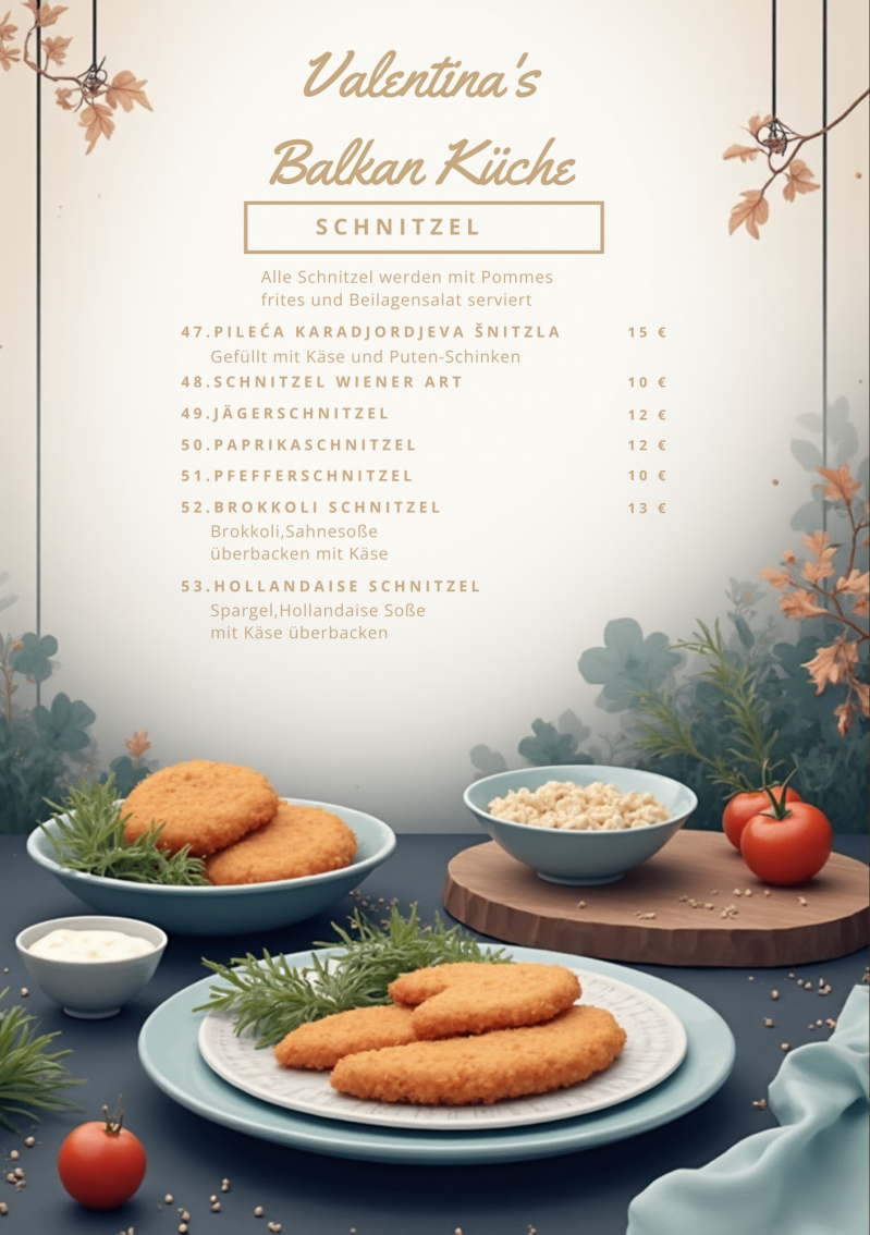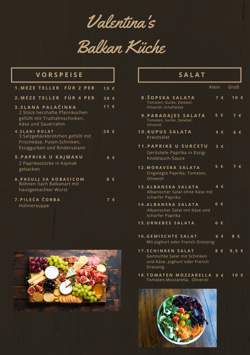Bei Valentina's Balkan Küche können Sie stets frisch zubereitete Gerichte erwarten. Wir legen größten Wert auf Qualität und verwenden nur die besten Zutaten, damit jedes Essen ein geschmackliches Highlight ist – vom ersten bis zum letzten Bissen.